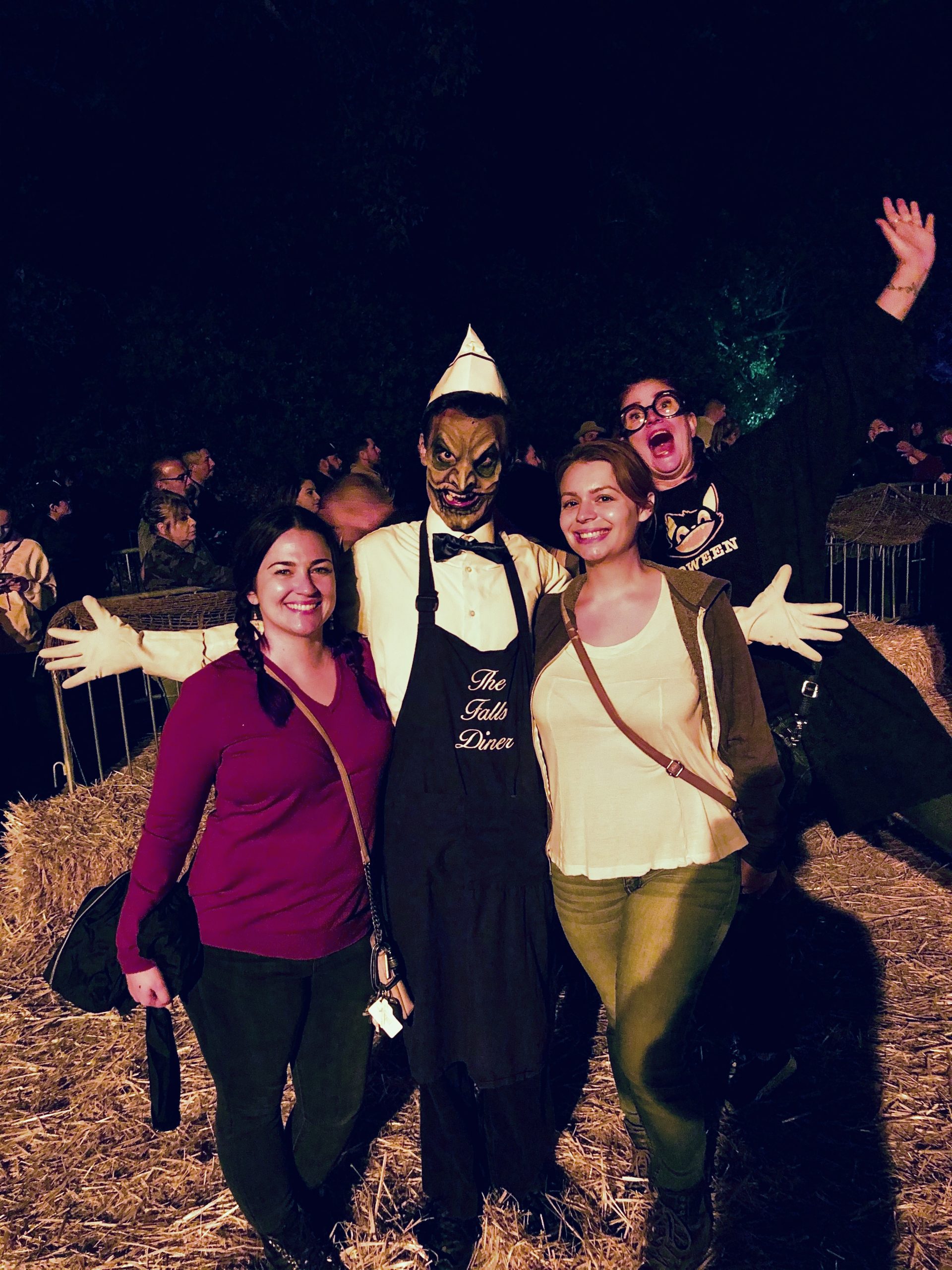Aside from the staple Hayride, there are still 3 more distinct maze-style attractions: Midnight Mortuary Haunted House, Trick-or-Treat and Roadkill Ranch. Midnight Mortuary was produced with the assistance of Sinister Pointe Productions, so as expected, the set design was very detailed. It was a traditional style walkthrough that took us through the town’s funeral parlor, as we uncovered their sinister secrets. Trick-or-Treat was the same concept as the guest favorite from previous LAHH years. This time, the monsters, ghouls and goblins were in on the celebration, donning their own Halloween costumes and partying with (while still sometimes scaring) the guests. Ringing the doorbell was a bit of an Easter egg for guests who had been previous years. It caused some thematic sound effects, but the monsters were mostly already out and about, not hiding and waiting. Some of the new houses this year were fantastic, and the meandering path through the 12 stops in the neighborhood made it a fairly long experience. Finally, back out towards the entrance, tucked up in the trees, was Roadkill Ranch. This was a barebones, mostly outdoor maze that took us through the barn, cornfields and hay stacks where we came face to face with the main highway’s previously deceased varmints. This maze relied heavily on the creepy outdoor atmosphere but seemed to be lacking in scareactors. Our favorite part of it was interacting with the suspicious farmhands over at the entrance of it.
