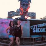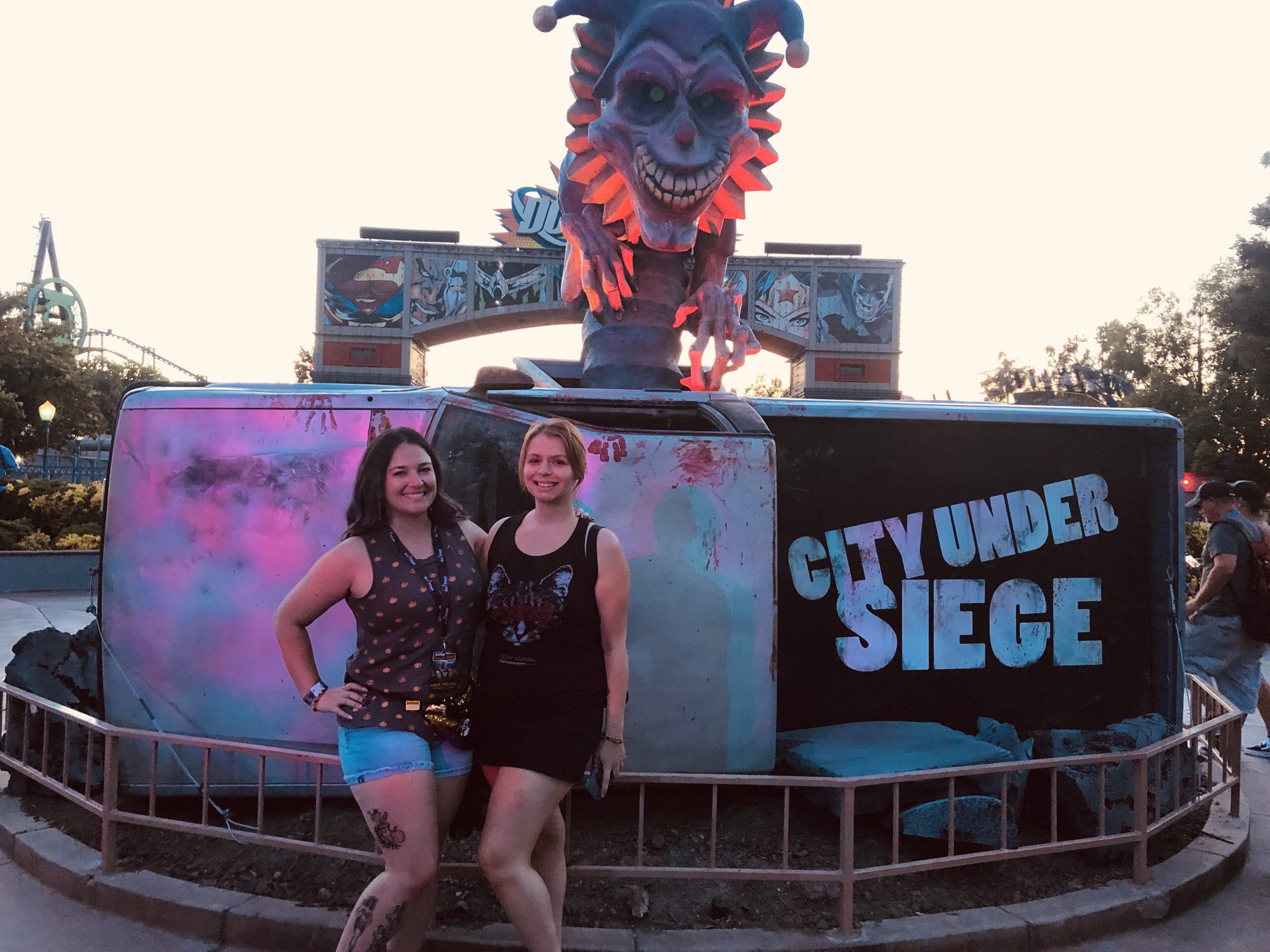 This was our first year attending Six Flags Magic Mountain’s Fright Fest so we were thrilled to be invited to the 2019 opening night event. We had met some of their monsters at a previous year’s Midsummer Scream convention, but aside from that, weren’t totally sure what to expect. We parked and were immediately greeted by over 100 degree heat! Fortunately, our first stop as media was upstairs at Full Throttle Sports Bar for some snacks and cold drinks (and air-conditioning). We spent some time mingling with our fellow haunt fiends before making our way over to the City Under Siege scare zone for the opening event, Unleashed, where the ‘ghouls, demented clowns, witches, demons and the twisted undead’ break out and begin to terrorize guests. The crowd around us was pumped up, screaming and cheering. It was a great way to kickoff the evening!