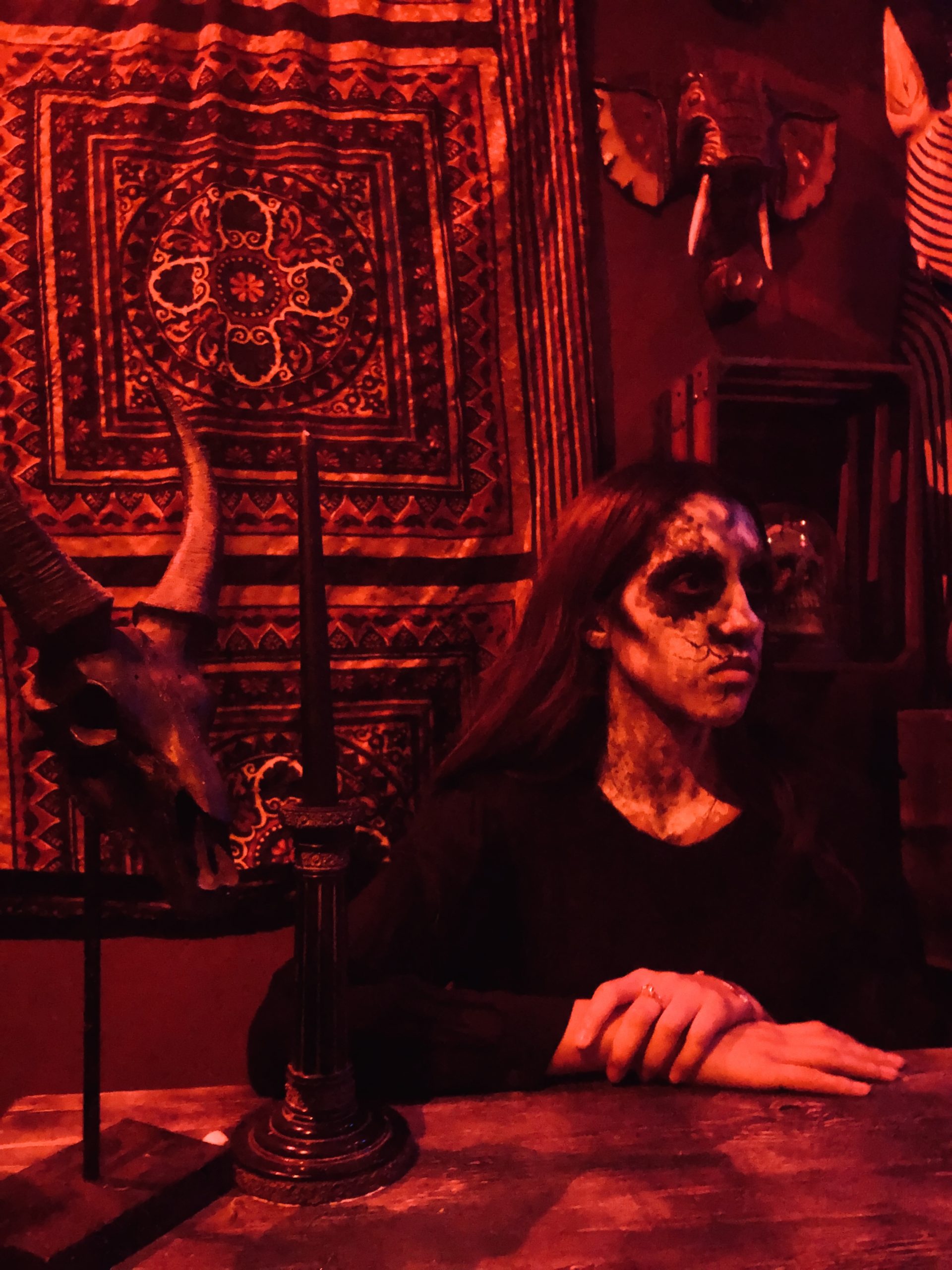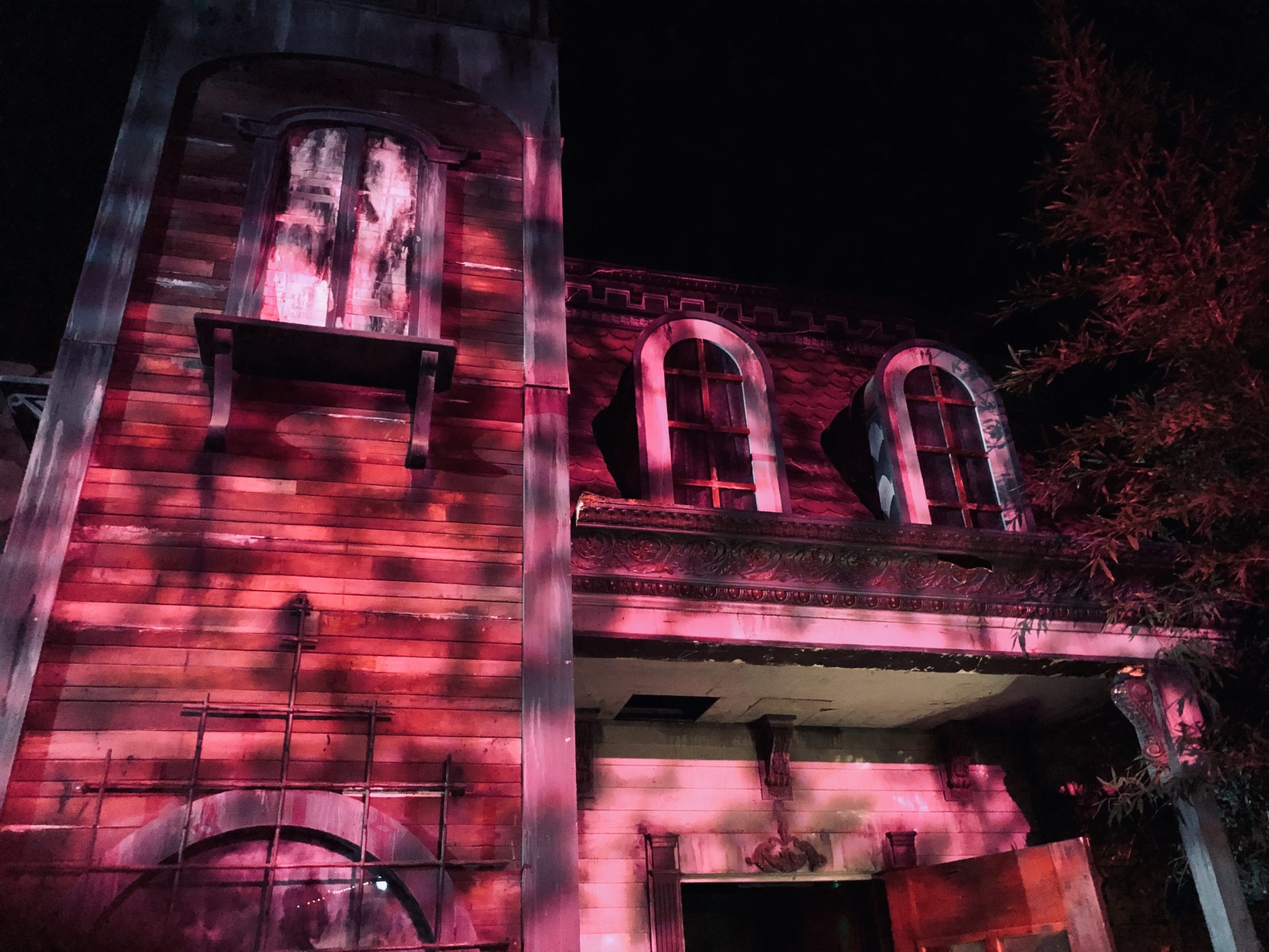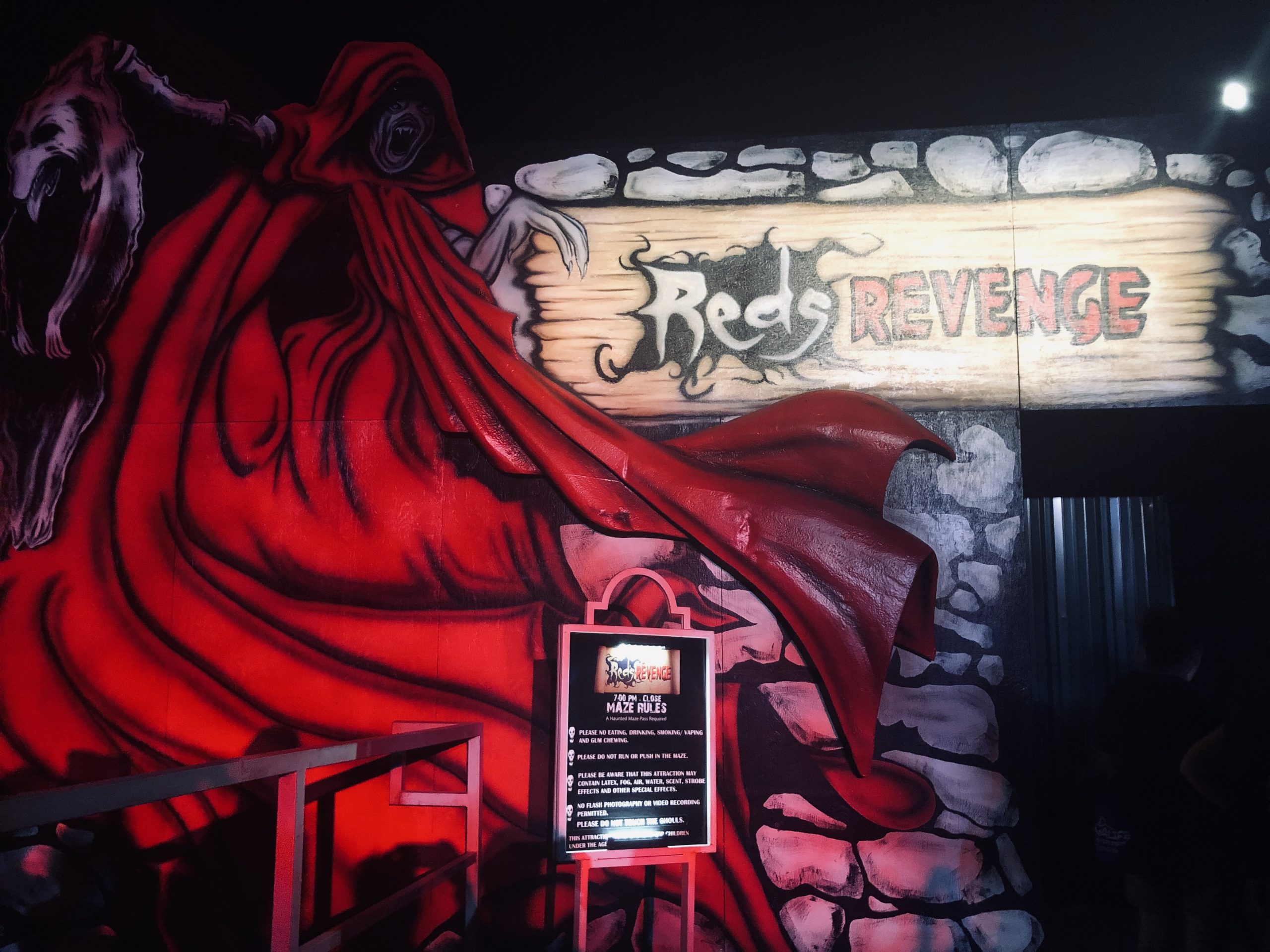 From there we ventured through the Nightmares: A Twisted Fantasy scare zone, where well-known fairy tales took an evil turn. The whole area is adorned with neon glowing scenes, and we enjoyed some great interactions with the creatures dwelling there before walking over to the next cluster of mazes. Condemned: Forever Damned, Red’s Revenge and Vault 666 Unlocked are all together near the entrance. We started with Condemned. It wasn’t especially unique, but the attention to detail in the set design, and the standout ‘undead Lucille Ball’ style scareactor still made it a pretty solid walkthrough. Red’s Revenge is a twisted tale about what happens after the Little Red Riding Hood story we all know ends. The maze had great jump scares, a variety in sets that kept the story flowing, more energetic scareactors, and even an encounter with the sultry Red herself. The last one in the area was Vault 666 Unlocked. If you know the password, the shop keep will grant you access to the hidden vault full of demonic relics and oddities. This maze was all over the place, but in a good way! Scenes ranged from a demon art gallery to a hallway of reaching arms, from a deadly overgrown greenhouse to a terrifying doll collection, all of which kept us on our toes, and made it our favorite maze of the night.