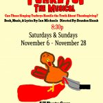 Zombie Joe’s Underground Theatre Group is proud to present the ultimate version of Ian Michaels’ Thanksgiving-Season theatre extravaganza, “TURKEYS! THE MUSICAL”! With harvest season upon them, a rafter of singing Turkeys seek to discover the truth behind the massive Turkey-Disappearance that happens every year, all while navigating the trials of Turkey-Love, Turkey-Family, and even some trouble from the Dog Cops!