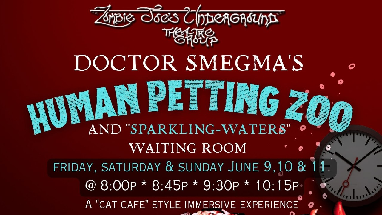 Zombie Joe’s Underground Theatre Group proudly presents their ghastly-new cat-cafe style immersive experience, where guests find themselves trapped within the nightmarish waiting room of Dr. Smegma, a purgatory teeming with his grotesque human experiments that yearn for your calming, therapeutic touch.